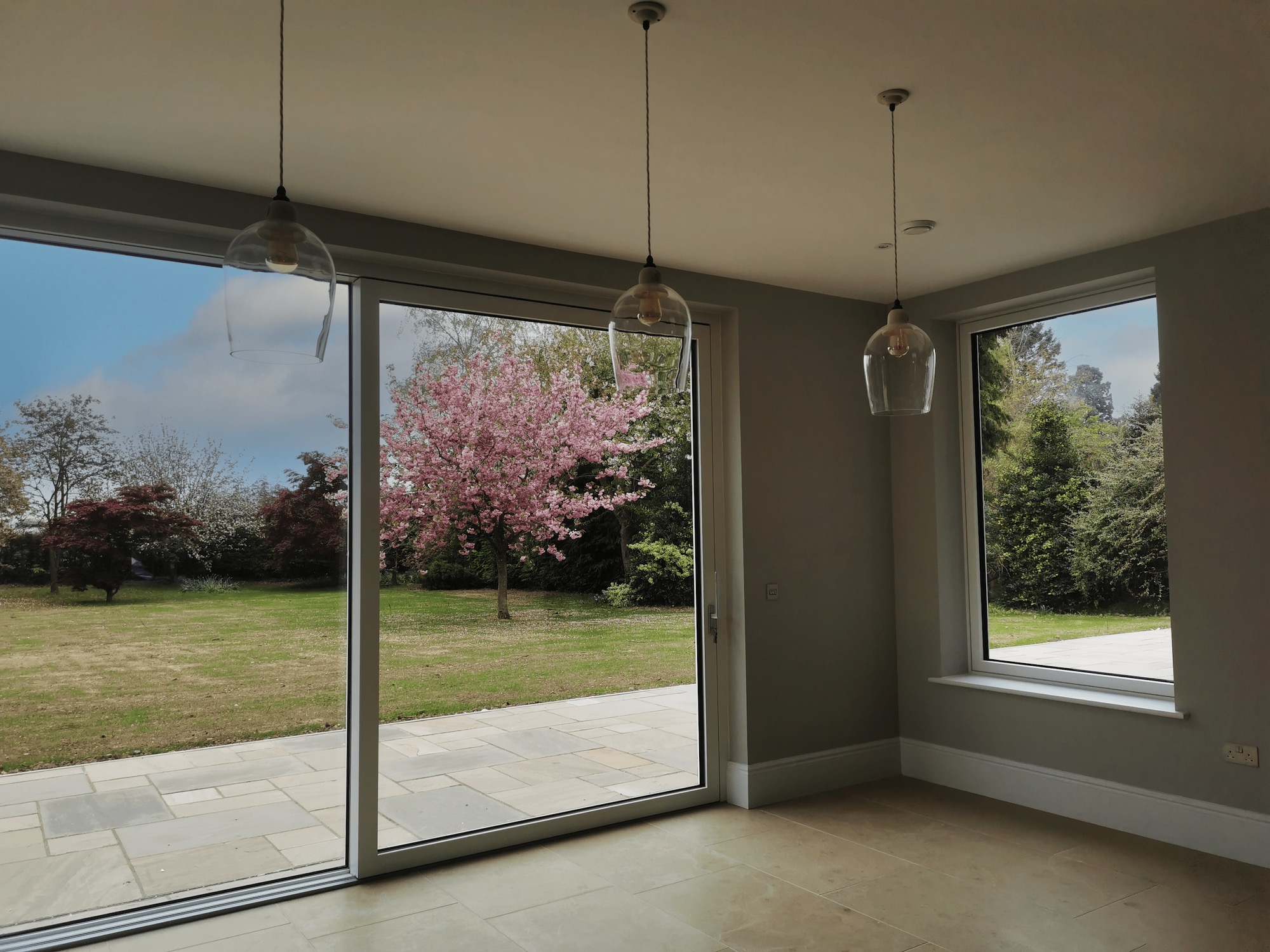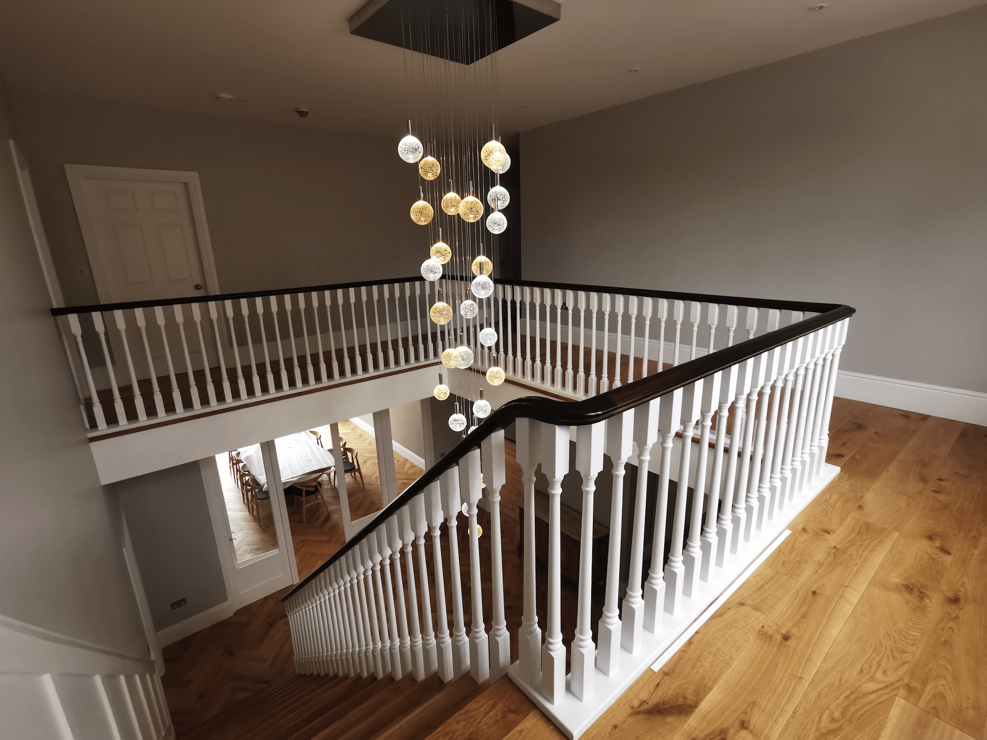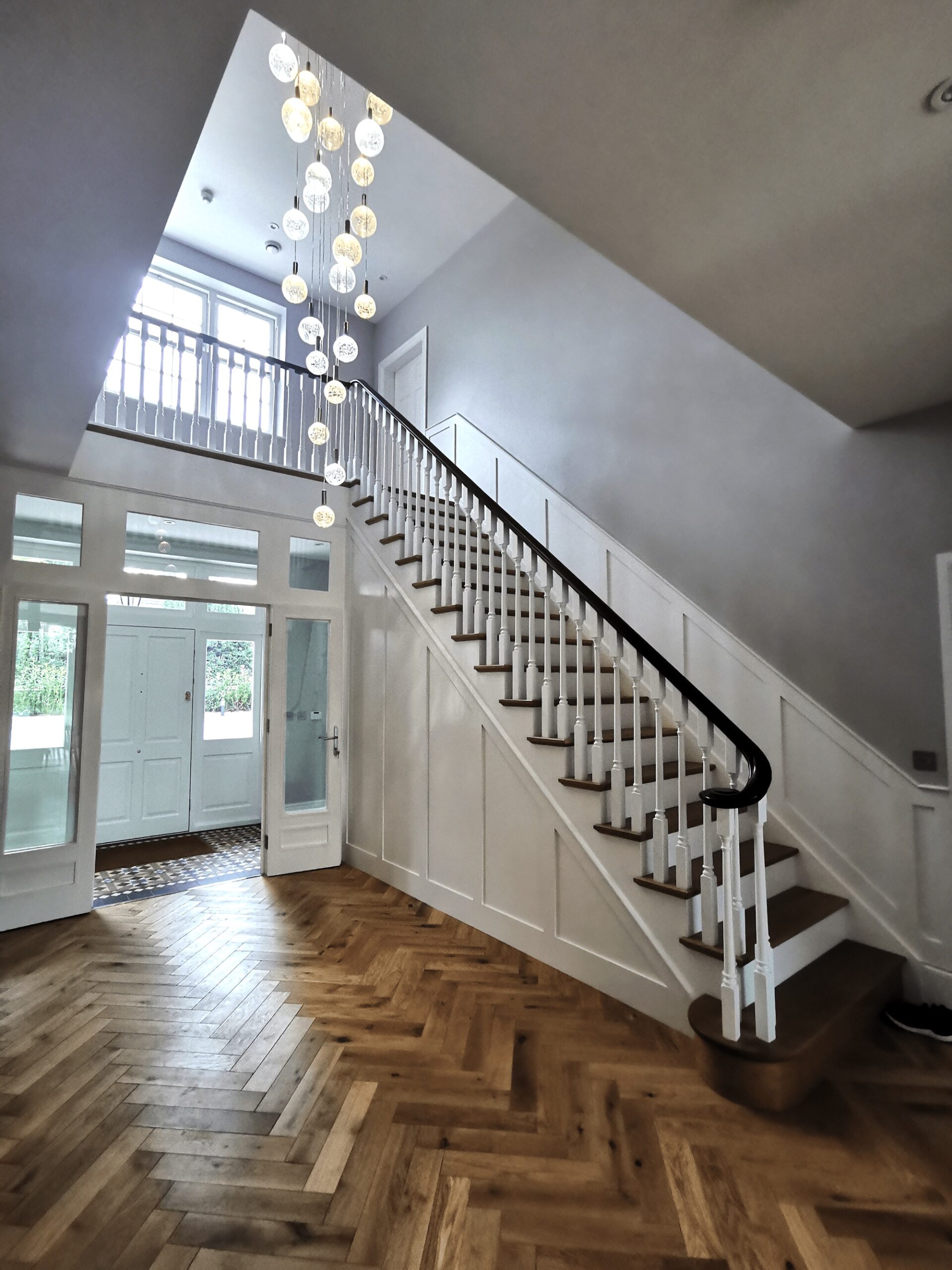 A grand portico porch leads to a spacious entrance hall featuring a bespoke oak staircase with continuous handrail and a chandelier. The rear elevation incorporates large glazed sections and level threshold doors, creating seamless connections to the extensive garden while maximising natural light. Boundary walls were designed with specialist structural details to protect existing plants and trees, and the project was delivered in partnership with Base Architects.