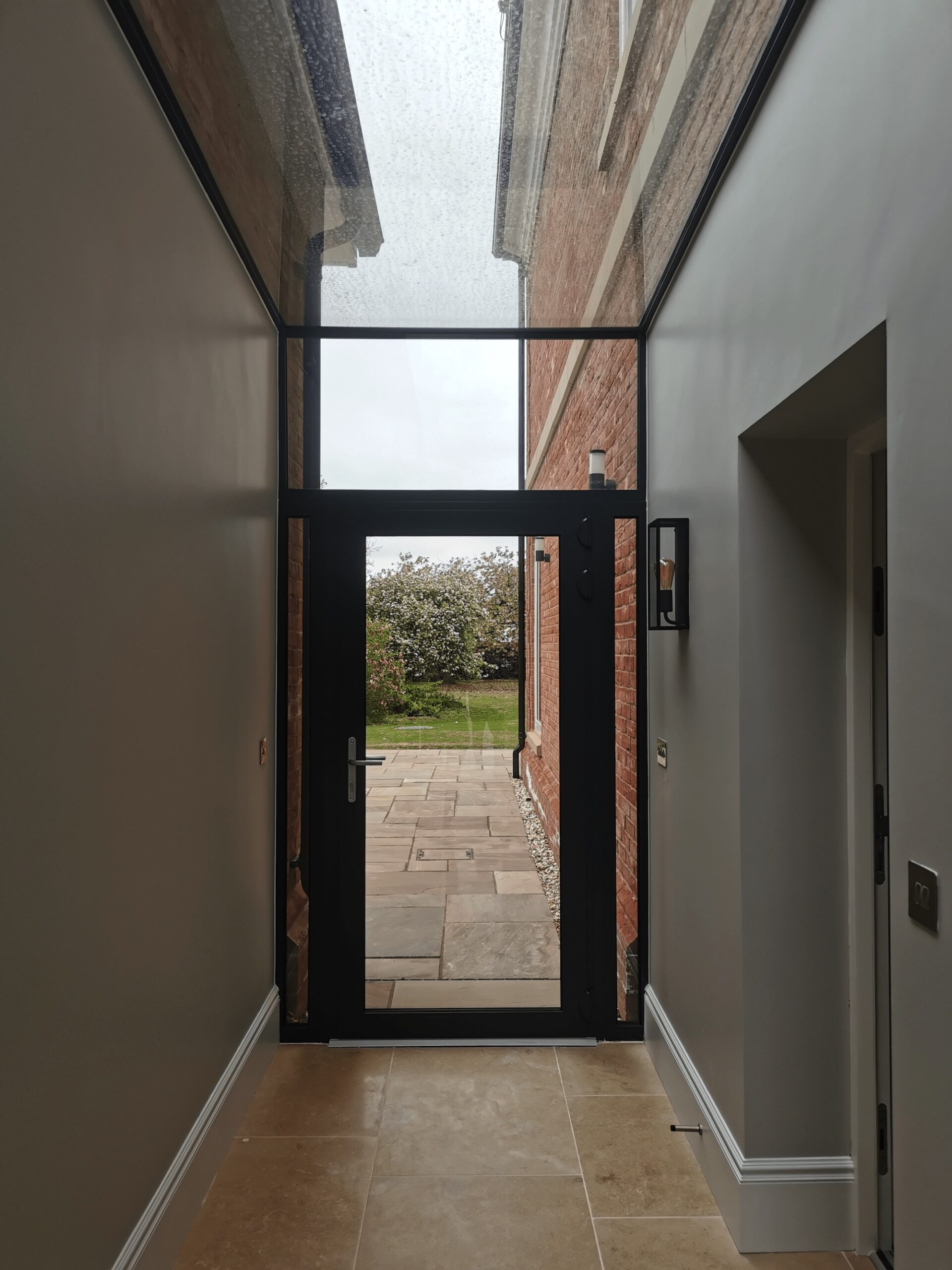 This six-bedroom property, inspired by Georgian architecture, was built in traditional brick with stone detailing. It included a large garage with annexe above, linked to the main house via a frameless glazed gallery. To facilitate the build, the existing dwelling was first demolished. The environmentally conscious client specified air source heat pumps, solar thermal panels, and a mechanical ventilation and heat recovery system, all of which were integrated into the project.